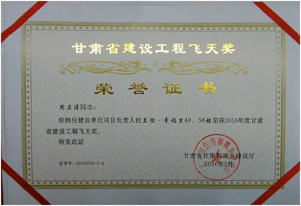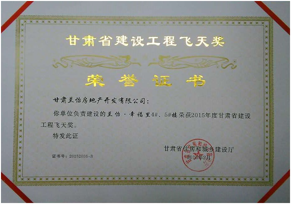 2016年2月5日,由甘肅省住房和城鄉(xiāng)建設(shè)廳評選的2015年度甘肅省建設(shè)工程“飛天獎”對社會各界發(fā)布,本次共發(fā)布41個“飛天獎”項(xiàng)目。其中,由甘肅中集實(shí)業(yè)集團(tuán)子公司甘肅蘭怡房地產(chǎn)開發(fā)有限公司開發(fā)建設(shè)的中集·幸福里憑借高品質(zhì)的開發(fā)標(biāo)準(zhǔn),喜獲甘肅省2015年度建設(shè)工程“飛天獎”榮譽(yù)稱號,成為蘭州市安寧區(qū)唯一獲此殊榮的項(xiàng)目。
