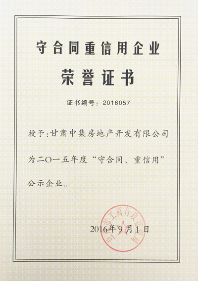 2016年9月1日,由蘭州市工商行政管理局評選的蘭州市2015年度“守合同重信用公示企業(yè)”對社會各界發(fā)布,本次全蘭州市共發(fā)布88個“守合同重信用公示企業(yè)”。甘肅中集實業(yè)集團有限公司子公司甘肅中集房地產(chǎn)開發(fā)有限公司憑借“重誠信、謀發(fā)展”的經(jīng)營發(fā)展模式,喜獲蘭州市2015年度“守合同重信用公示企業(yè)”榮譽稱號,為甘肅中集集團發(fā)展里程再添輝煌。