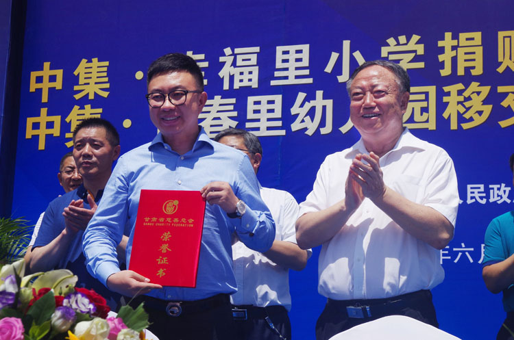 甘肅省慈善總會(huì)朱志良會(huì)長向甘肅中集實(shí)業(yè)集團(tuán)有限公司董事長周啟濤頒發(fā)榮譽(yù)證書