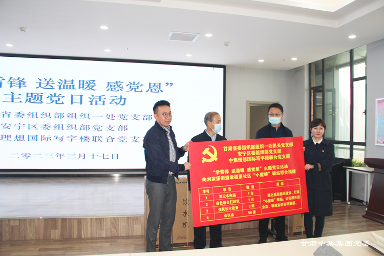 2023年3月17日,甘肅省委組織部組織一處黨支部、安寧區(qū)委組織部黨支部、甘肅中集集團(tuán)黨委聯(lián)合開展“學(xué)雷鋒 送溫暖 感黨恩”主題黨日活動(dòng)——向劉家堡街道幸福里社區(qū)“小蜜蜂”驛站聯(lián)合捐贈(zèng)價(jià)值3萬余元的配套設(shè)施。